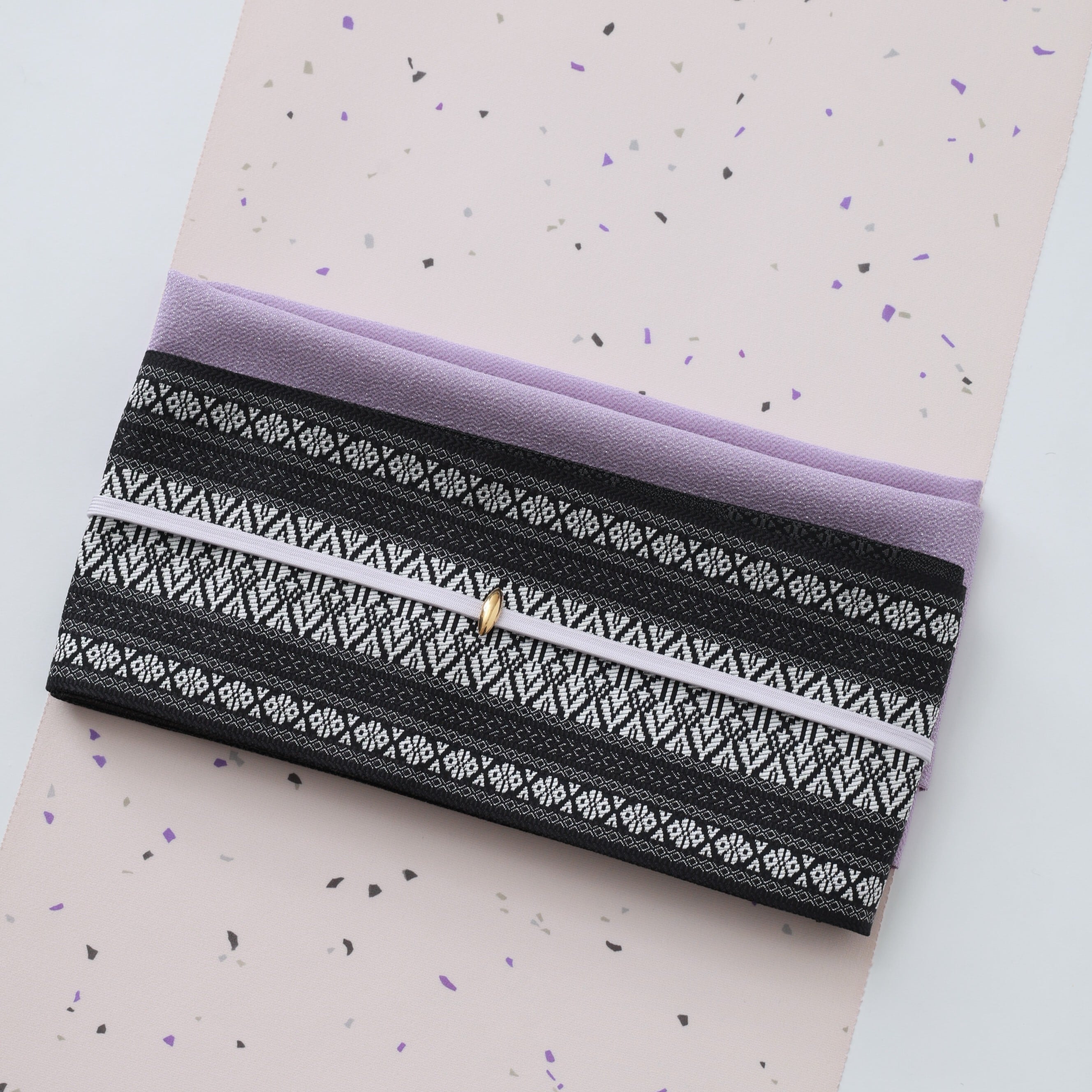 一般的な博多織の小袋帯といえば、ツルっとした風合いのモノが大半ですが、この織柄は「光の当たり具合で帯全体の色に変化が出る」という特徴があり、帯全体にしっかりと幾何学柄を配して、重厚感を持たせました。