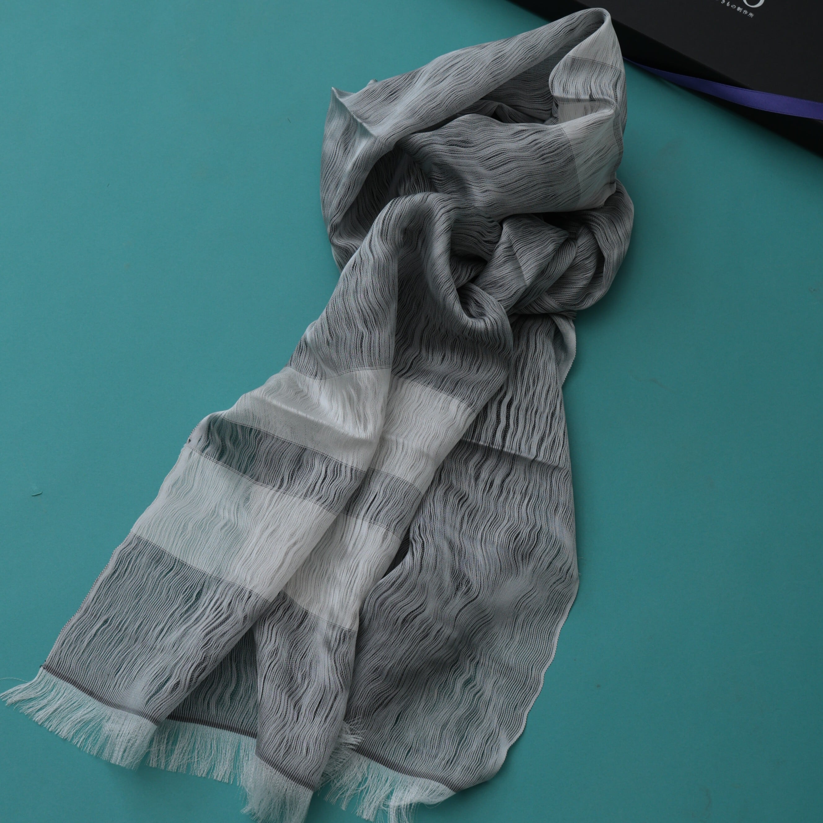 薄手に仕上げた織りに手加工で揺らぎ表現を加えた涼しげなストールは「30g」という驚きの軽やかさ。